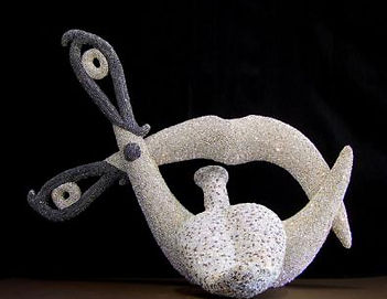 Dans cette série de sculpture, j'utilise des couleurs différentes pour deux visages qui représentent deux identités différentes de la même personne. Leurs visages, couverts de perles sont d'une matière brillante et fantastique, d'ailleurs, la forme au-dessus de la tête est aussi une forme surréaliste issue d'un rêve...